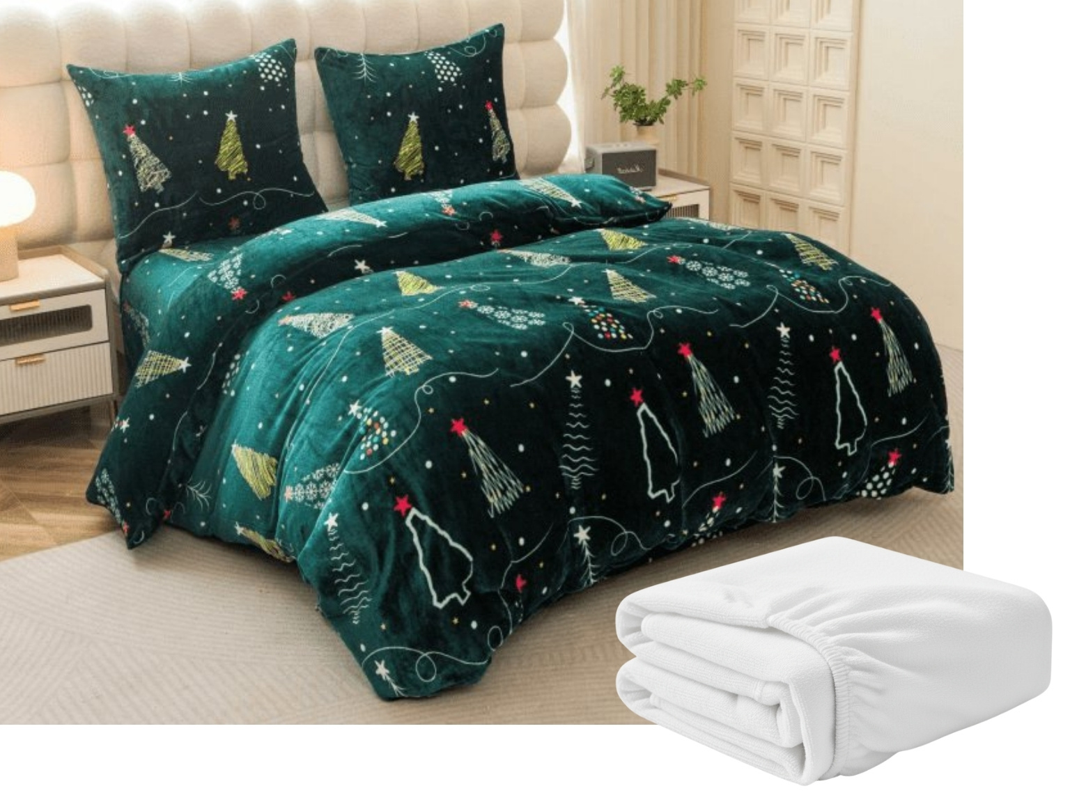 Sada mikroplyšového povlečení CHRISTMAS DRIFT zelené + prostěradlo mikroplyš SOFT 180x200 cm bílé, dvoulůžko Rodinné balení s akční cenou